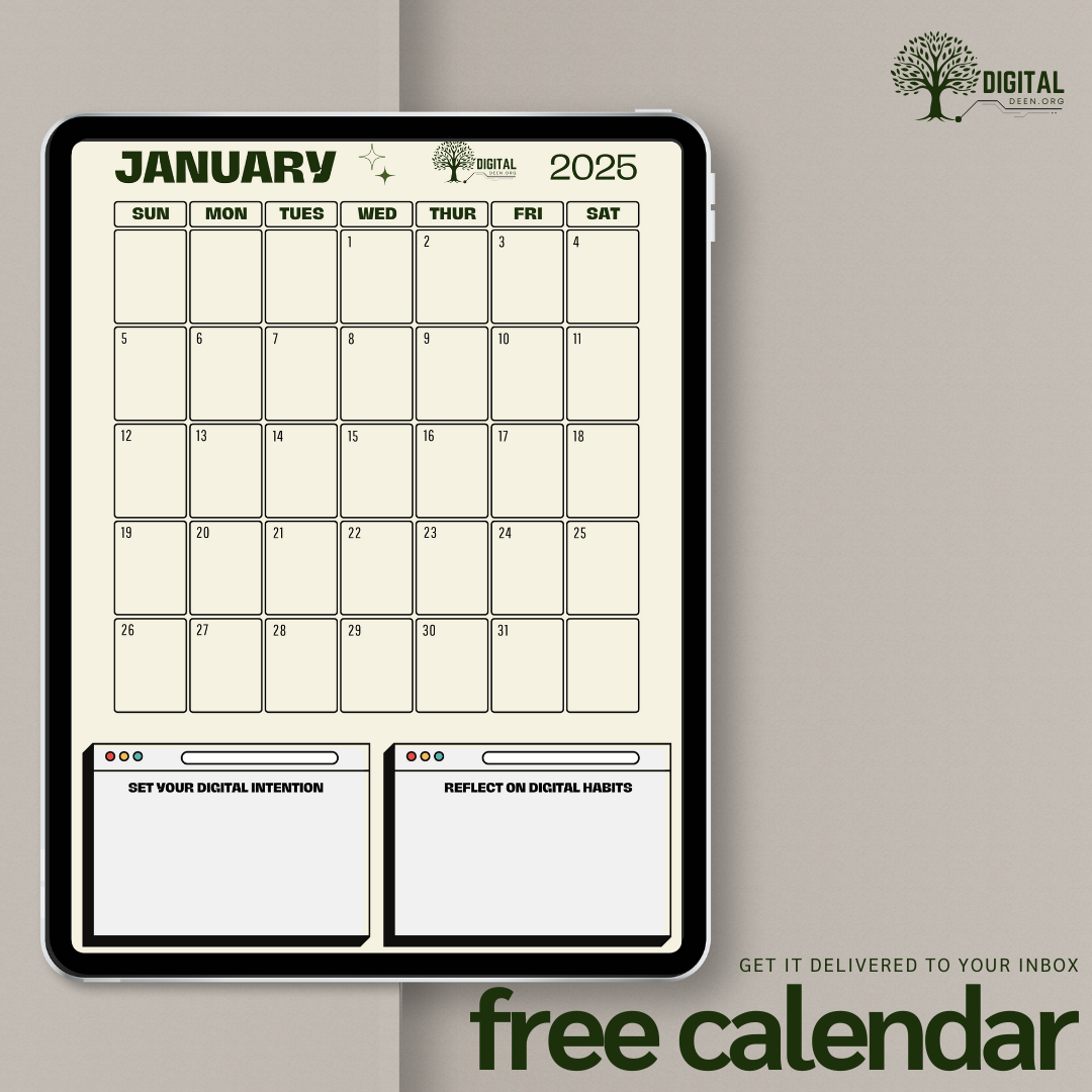 The FREE DigitalDeen 2025 Calendar is your companion for staying intentional and balanced throughout the year. With its unique focus on digital mindfulness, this planner encourages you to align your daily technology usage with your broader spiritual and personal goals.